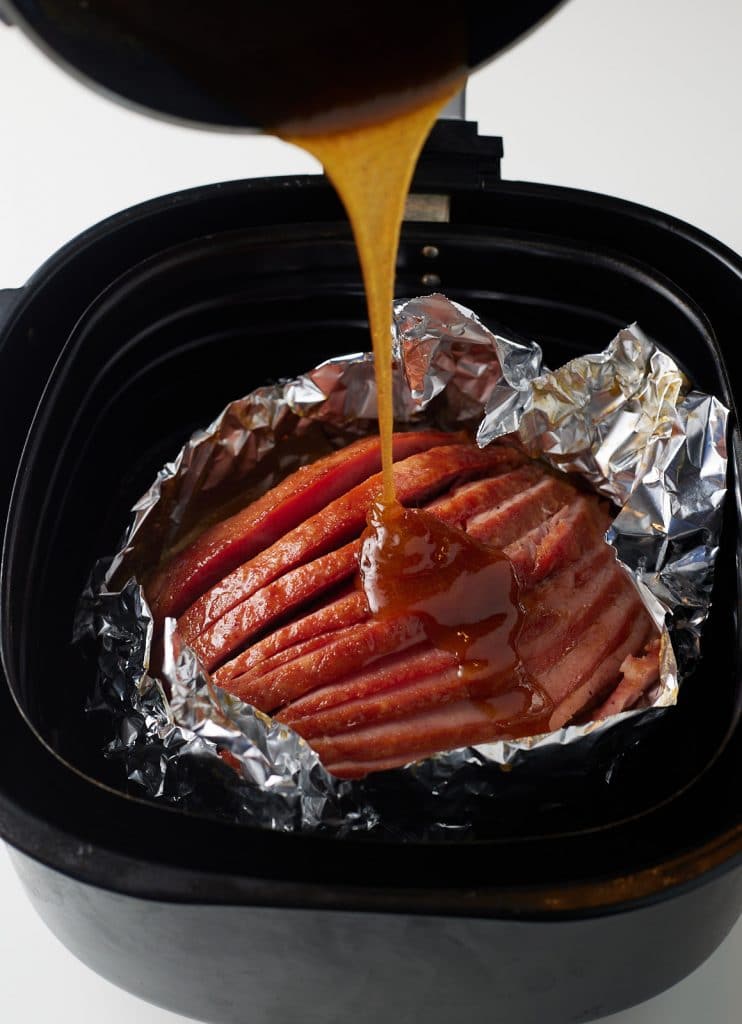 This air fryer holiday ham comes out so succulent and the honey and mustard spiced glazed will leave everyone asking for seconds!