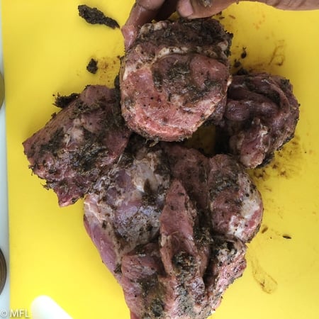 - Rub pork pieces with jerk marinade and allow it to marinate pork for 4-24 hours in the refrigerator. The longer the better.