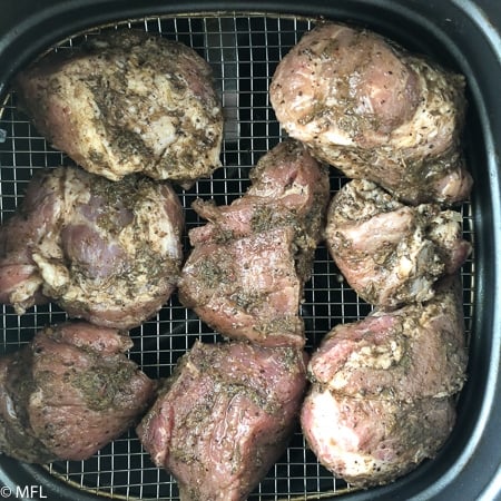 - Remove pork from the fridge and allow to rest at room temp for 20 minutes. Place in air fryer ensuring they are spaced apart. Set time for 20 minutes, flip halfway.