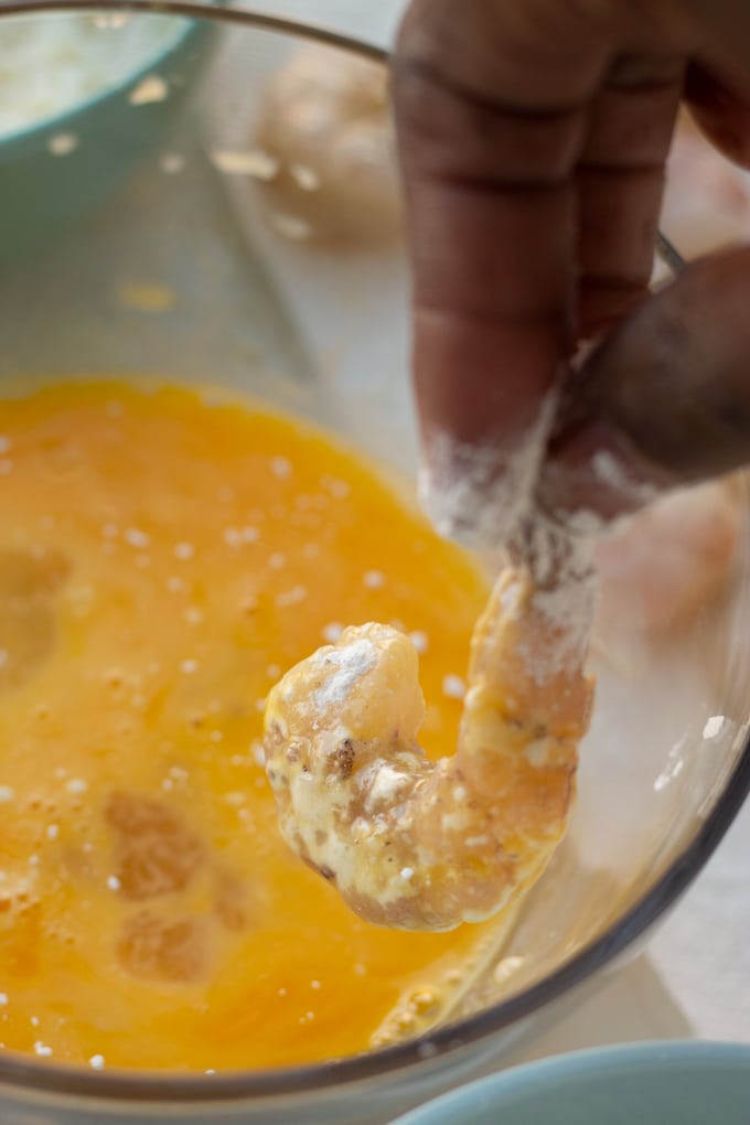 Then, dip each piece of shrimp in your bowls in the following order: First the flour, next the egg, and then the panko and shredded coconut mixture.