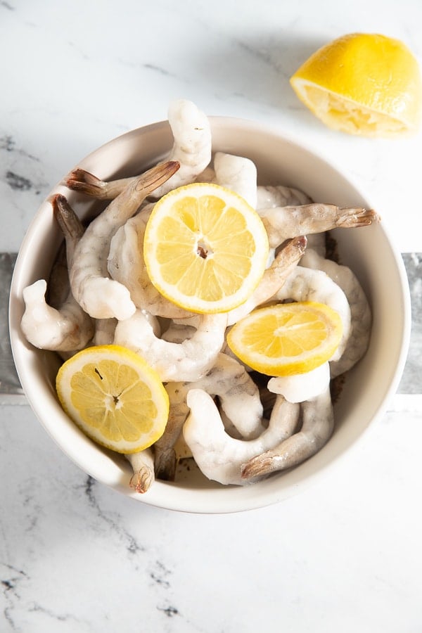 One of the main reasons I love this recipe is that you can use frozen shrimp, right out of the packet. You just need to make sure that they are deveined. You can use shelled or unshelled, I prefer to use shelled as they tend to be more juicy.