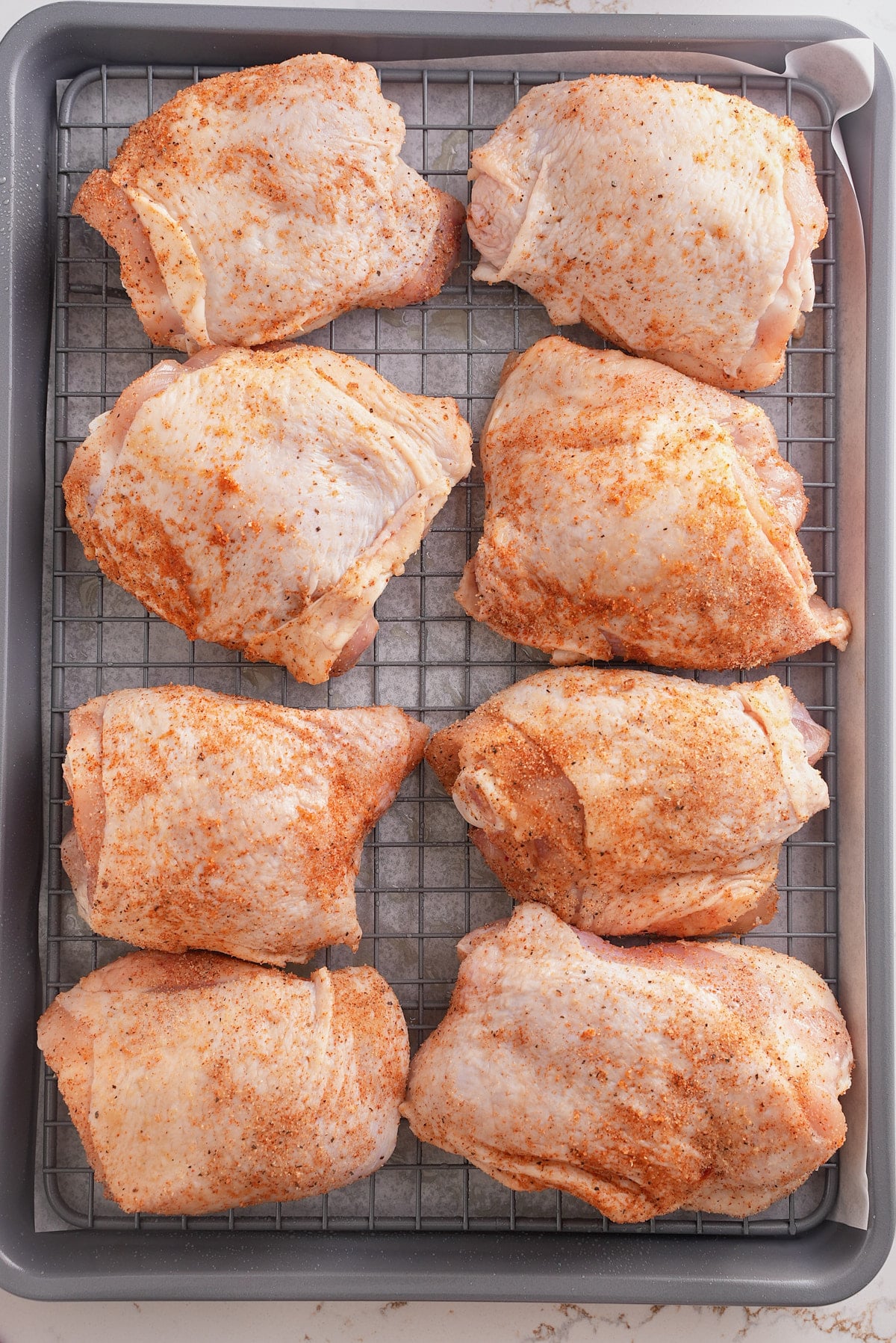 3. Line a baking sheet with parchment paper or lightly grease it with cooking spray. Add a baking rack on top of the sheet tray and spray the rack with cooking spray. Place the chicken thighs on the rack in a single layer, skin-side up. Bake in the preheated oven for about 35-40 minutes or until the internal temperature of the chicken reaches 165°F (74°C).