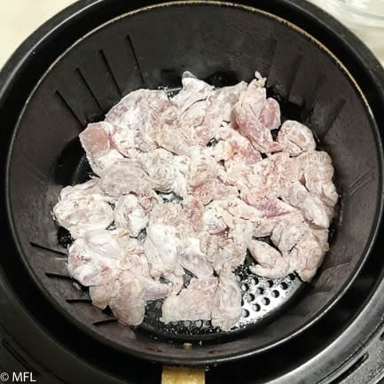 You will also want to make sure that your air fryer basket is properly oiled. I just put a little olive oil on a paper towel and rub it all over the bottom of my basket. That way the chicken pieces won't stick when frying. This is the only oil you will need for frying the chicken pieces in this recipe. How awesome is that?!?