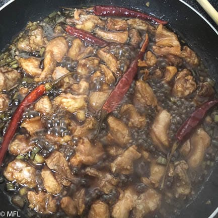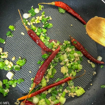 - Meanwhile, prepare sauce by heating vegetable oil in skillet over medium-high heat. Once hot, add green onions, dried chilies, garlic, and ginger and stir fry for about 1 minute, until chillies brighten in color and onions have softened.