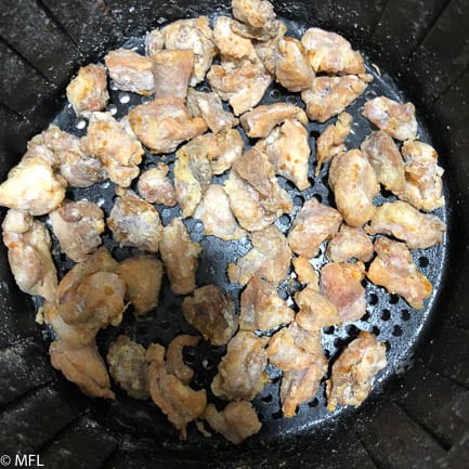 The beauty of this dish is that while your chicken pieces are cooking in the air fryer, you can work on creating your sauce on the stovetop. Dump the chicken pieces into the sauce when they are done cooking for the perfect weeknight dinner.