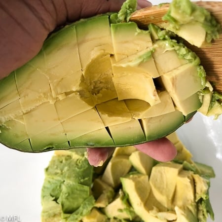 You'll want to start by cutting your avocado in half, around the huge seed in the middle and separating it into two. Next, cut your avocado in medium sized square pieces, slicing the avocado but not cutting through the skin. I use a small paring knife. Lastly, you will take a spoon and scoop the avocado into the bowl. Your avocado should fall into the bowl in nice square pieces.