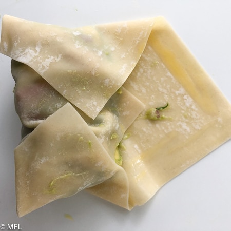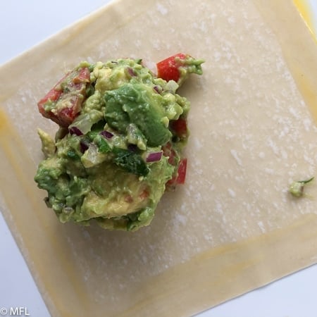 - Fill each egg roll wrapper with about ⅓ cup of avocado filling near a corner.