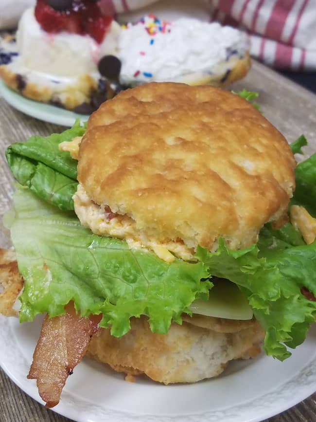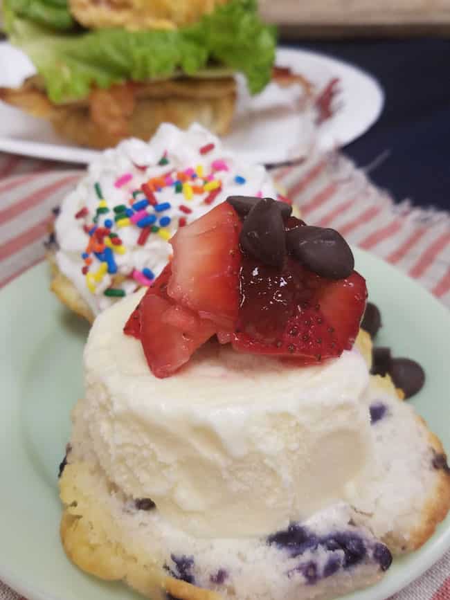 Now of course I could have eaten these biscuits just like they were but since I was at the test kitchen, I had to have some fun and create masterpieces with my biscuits. My sandwich was good but that dessert biscuit I made was something else. Ever had a bo berry biscuit?? It's a Bojangles biscuit with blueberries and icing. Now they are good by themselves but when you add some whip cream and sprinkles, it takes it to a whole other level.