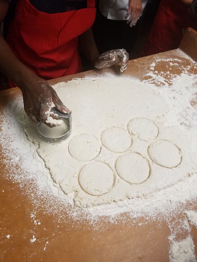 Then we use our biscuit cutter to cut all of these biscuits. I was supposed to get 15 biscuits out of my dough and somehow I only got 14. Oooops.