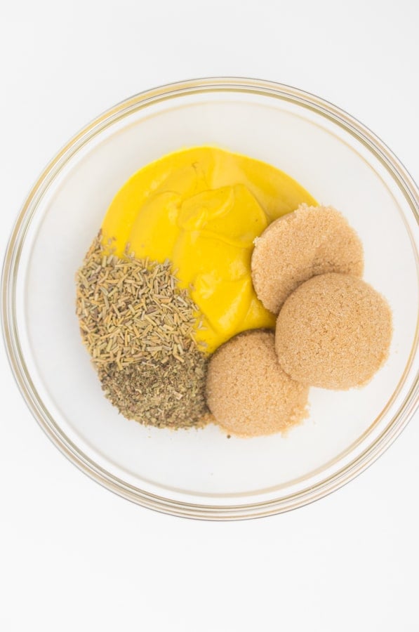 - In a small bowl, whisk mustard, brown sugar, italian seasoning, and rosemary in a bowl until thoroughly combined. Pour and rub mustard mixture all over pork. Place in refrigerator to marinate for at least 2 hours.
